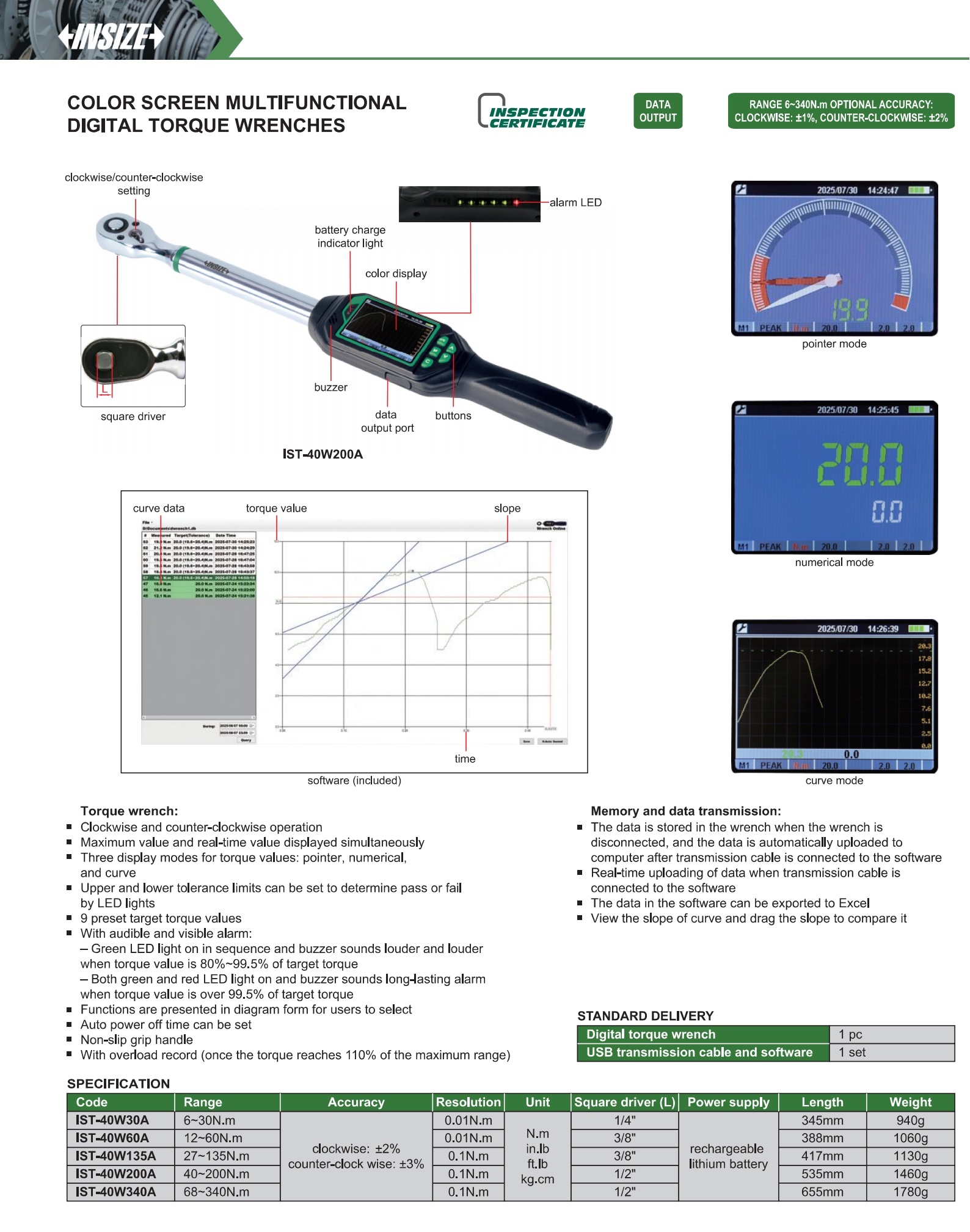 | IST-40W200A | Digital | 40~200N.m | Wired software transmission | Color screen and curve | Fixed ratchet head |