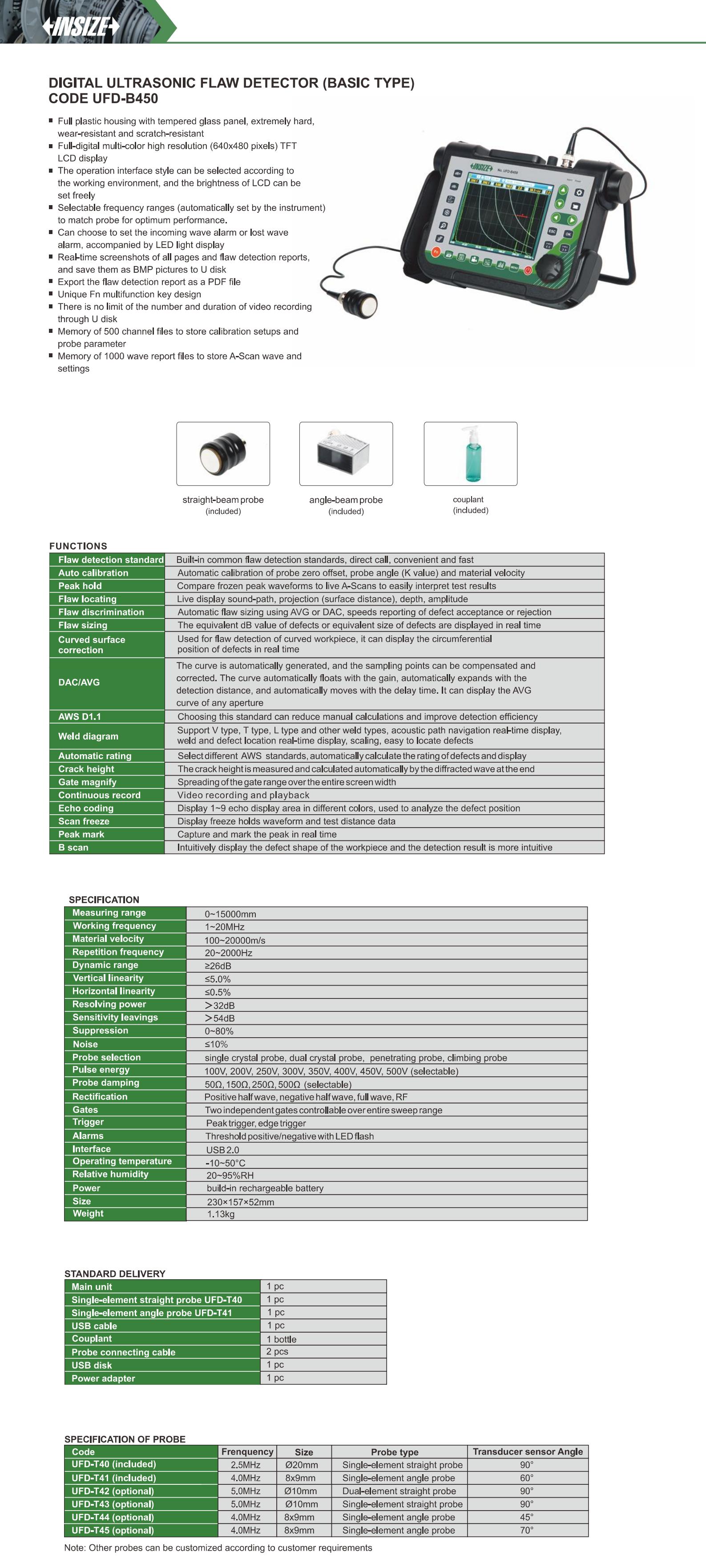 | UFD-B450 | 0~15000mm | 1~20MHz | ≤5.0% | ≤0.5% | ≥26dB | ˃32dB | ˃54dB |