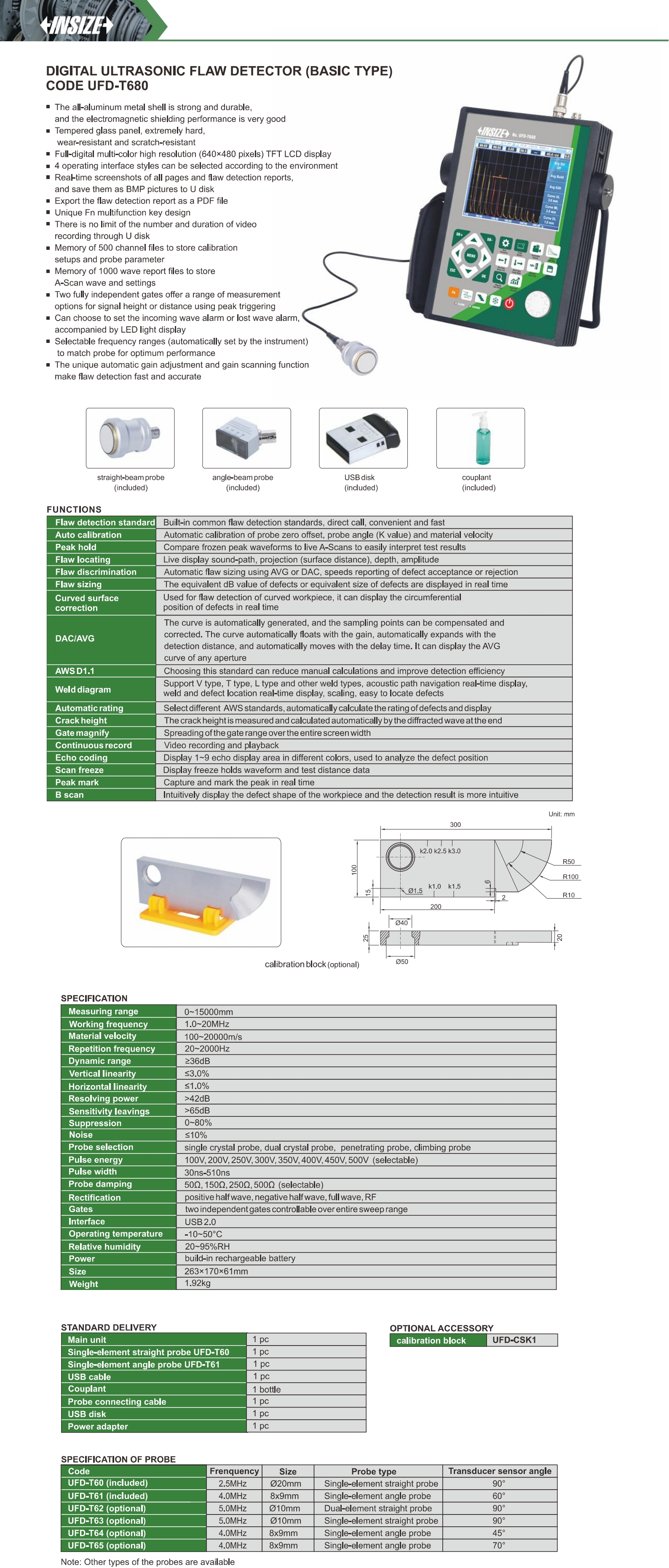 | UFD-T680 | 0~15000mm | 1.0~20MHz | ≤3.0% | ≤1.0% | ≥36dB | >42dB | >65dB |