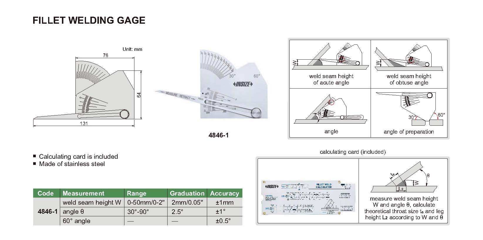 | 4846-1 | 0-50mm/0-2" | ±1mm | 2mm/0.05" | weld seam height W |