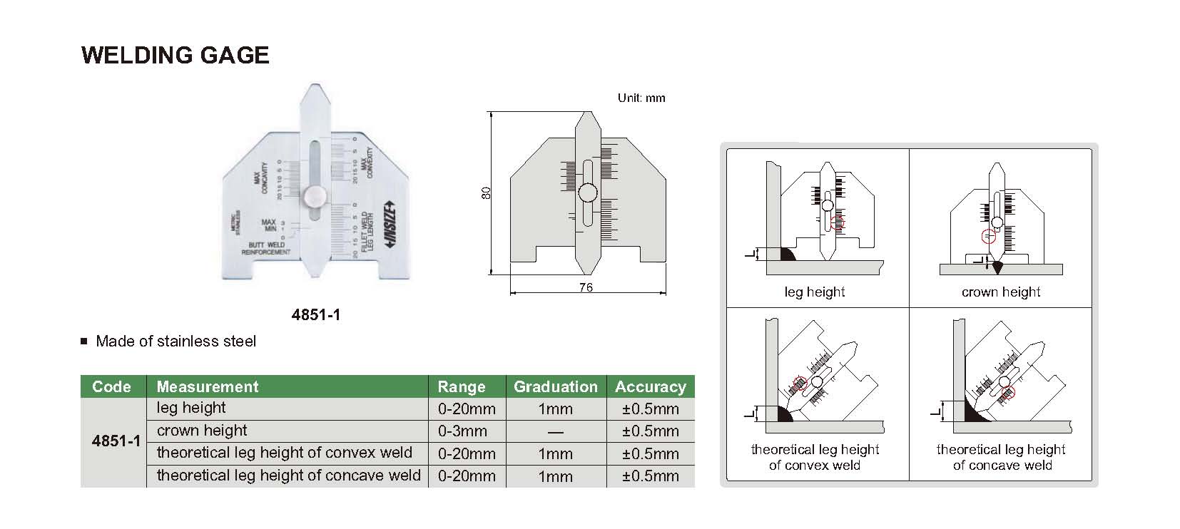 | 4851-1 | 0-20mm | ±0.5mm | 1mm | theoretical leg height of concave weld |