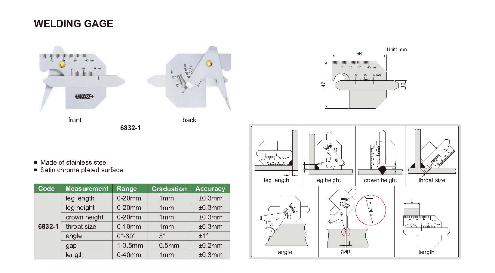 | 6832-1 | 0-10mm | ±0.3mm | 1mm | throat size |